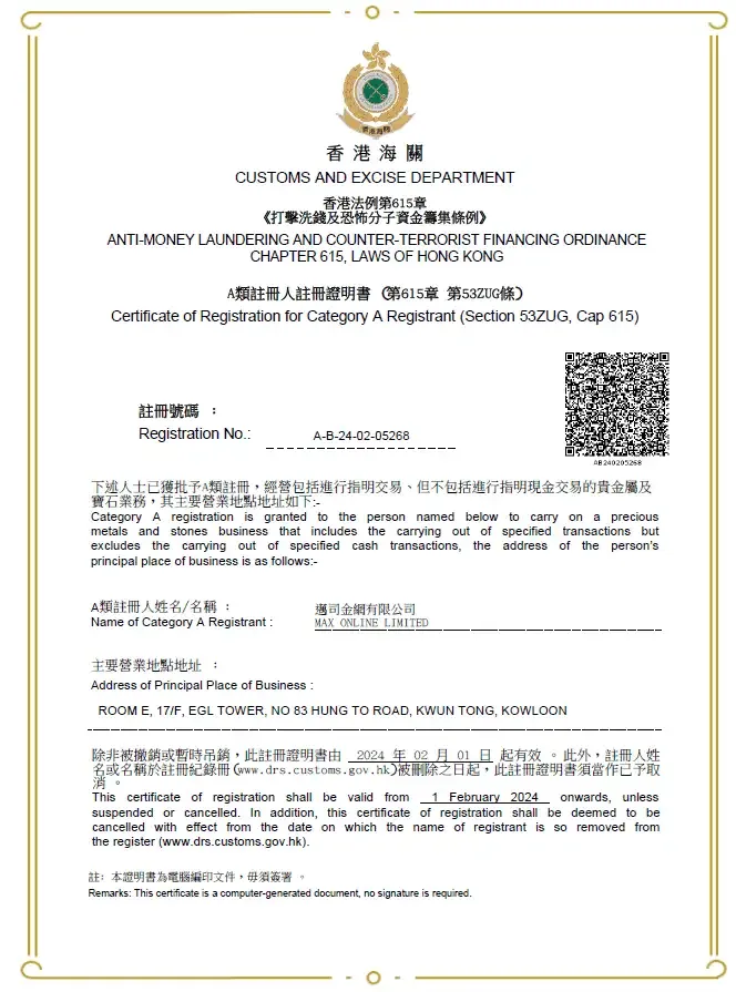 Max Online Gold is a brand operated under Max Online Limited (“MOL”), an indirect wholly-owned subsidiary of the listed company on Hong Kong Stock Exchange (HKEX: 8635). The Group has a diversified portfolio of businesses and a healthy financial position. As a pioneer in Hong Kong’s fintech industry, we have been a long-term partner of various financial institutions by supporting the development and provision of financial trading services. We strike to improve the order execution and trading experience of our customers, please stay tuned.