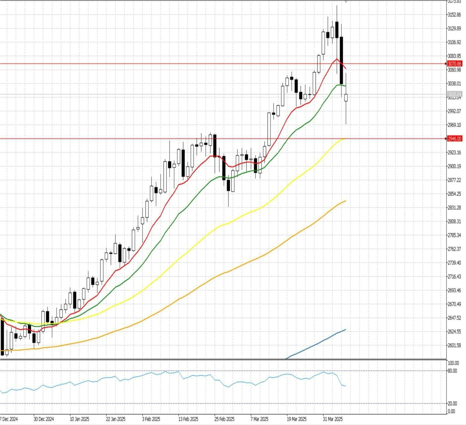 过去几个交易日因环球资产市场大幅下挫,美股指数过去两个交易日已跌超 10%,执笔时美股期货仍然持续下跌近 3%,金价在极度波动的环球市况下未能发挥避险功能,包括今天在内,过去三日从高点约 3167 美元下跌至今早的 2970 美元,跌幅达 6%。