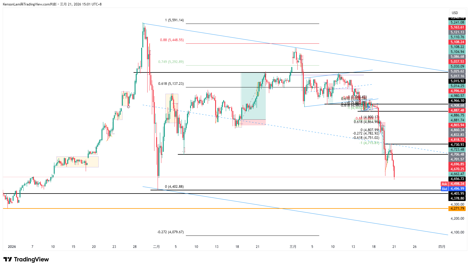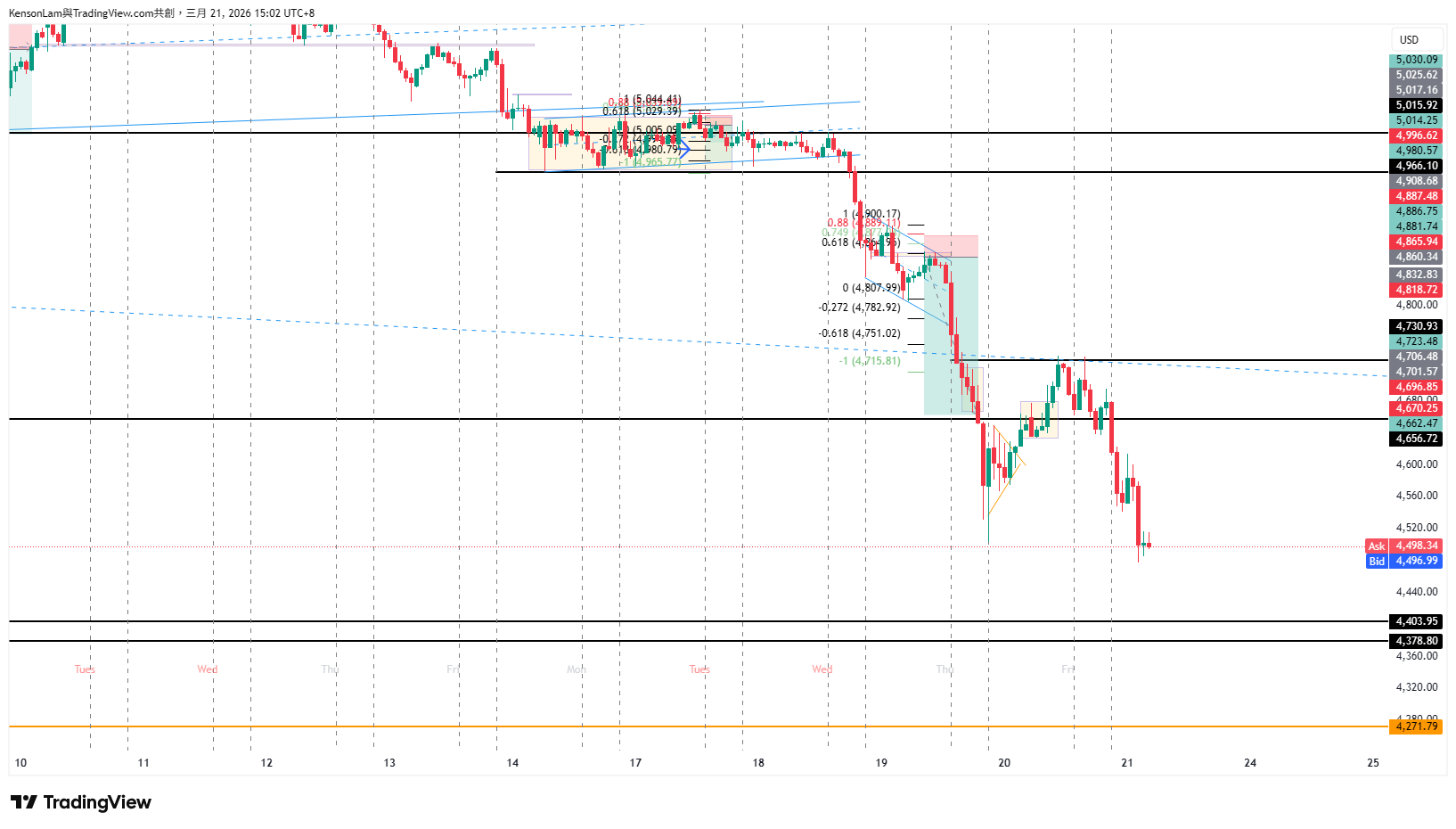 週一開市後跌穿震盪底部,及在週三四出現明顯的下跌動能,現時小時圖方向仍然看跌,但現價4496已接近2月跌段的前底和日圖的前頂4400-4380範圍的支持,向下做空間不多,等明顯跌穿這支持後用細圖在小時圖的阻力位等機會會較有優勢。